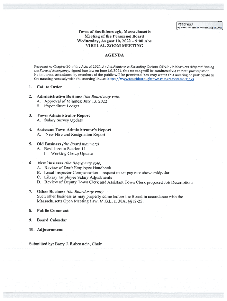 Received Town Clerk/am bat 10:46 am, Aug 05, 2022JTown of South borough, Massachusetts Meeting of the Personnel Board Wednesday, August 10, 2023 9:00 AM VIRTUAL ZOOM MEETING AGENDA Pursuant to Chapter