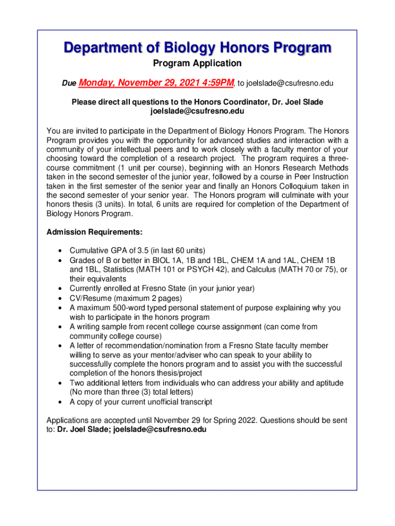 Department of Biology Honors Program Application Due Monday, November 29, 2021 4:59PM, to joelslade@csufresno.edu Please direct all questions to the Honors Coordinator, Dr. Joel Slave joelslade@csufresno.edu