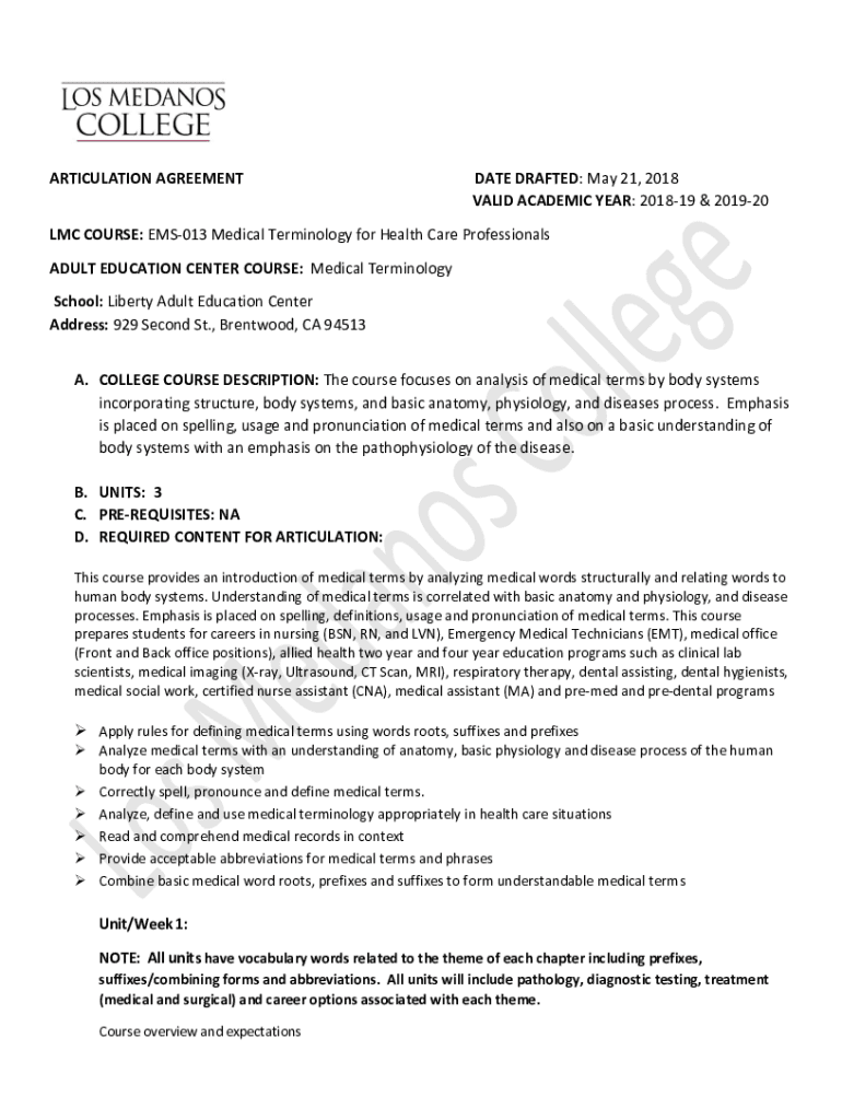 ARTICULATION AGREEMENTDATE DRAFTED: May 21, 2018, VALID ACADEMIC YEAR: 201819 & 201920LMC COURSE: EMS013 Medical Terminology for Health Care Professionals ADULT EDUCATION CENTER COURSE: Medical Terminology