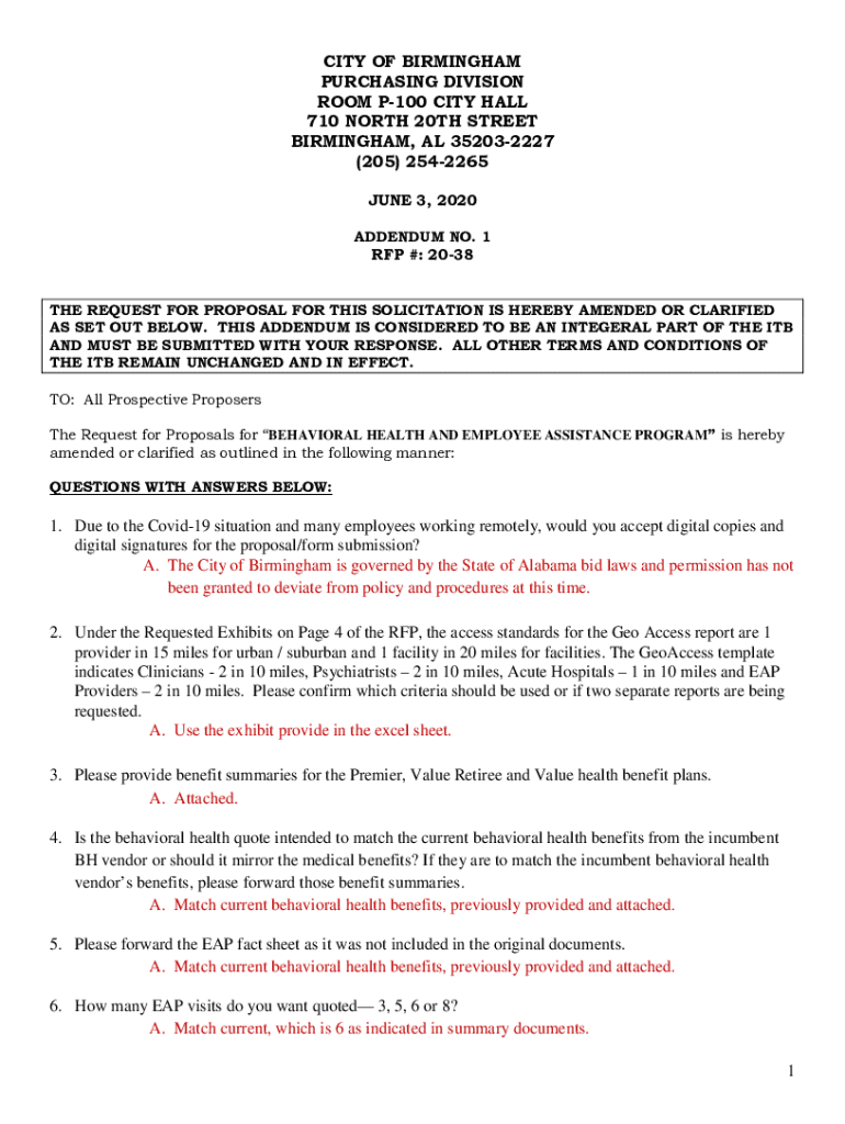 CITY OF BIRMINGHAM PURCHASING DIVISION ROOM P100 CITY HALL 710 NORTH 20TH STREET BIRMINGHAM, AL 352032227 (205) 2542265 JUNE 3, 2020, ADDENDUM NO. 1 RFP #: 2038 THE REQUEST FOR PROPOSAL FOR THIS SOLICITATION