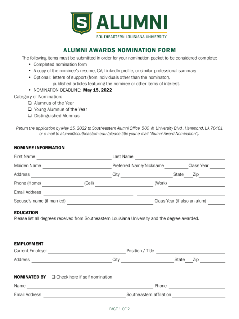 Get the free ALUMNI AWARDS NOMINATION FORM - Southeastern Louisiana ...