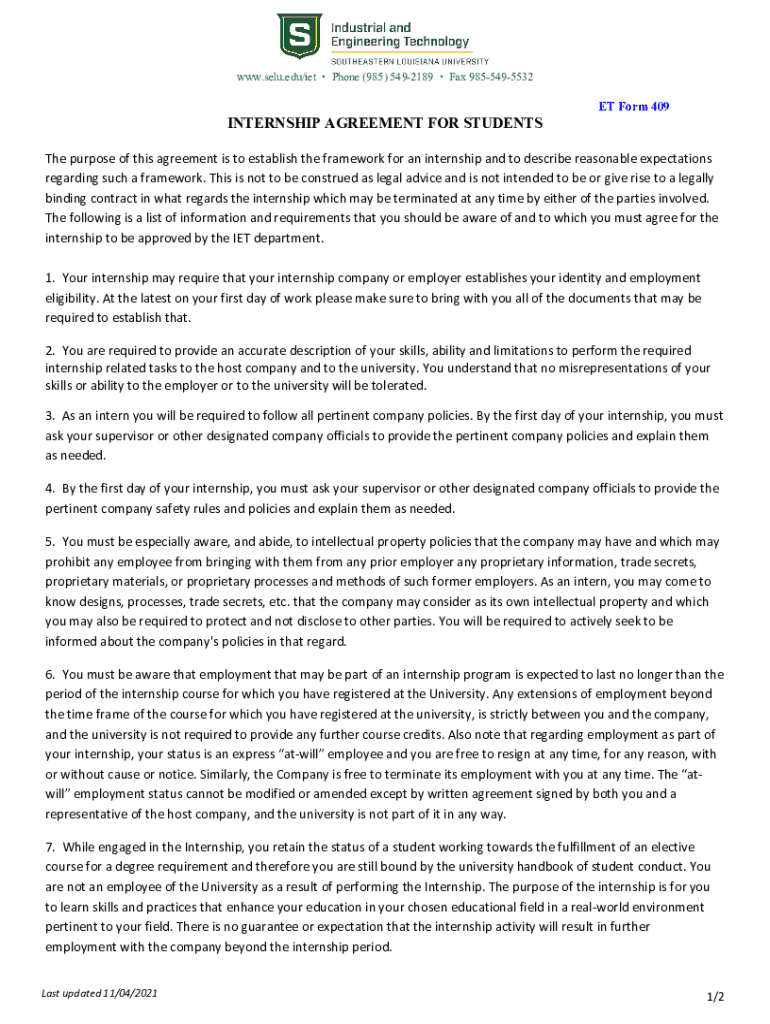 Www.selu.edu/iet Phone (985) 5492189 Fax 9855495532ET Form 409INTERNSHIP AGREEMENT FOR STUDENTS The purpose of this agreement is to establish the framework for an internship and to describe reasonable