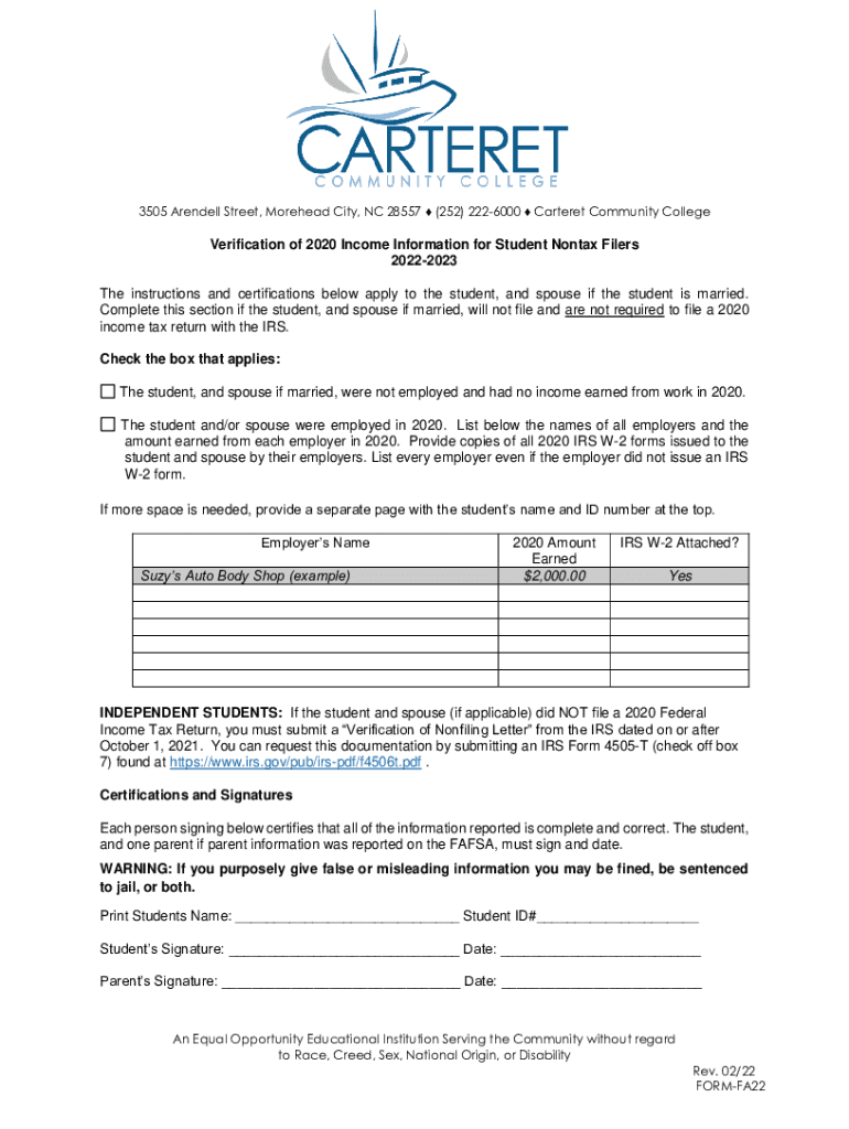 3505 Aren't dell Street, Forehead City, NC 28557 (252) 2226000 Carteret Community CollegeVerification of 2020 Income Information for Student Nontax Filers 20222023 The instructions and certifications
