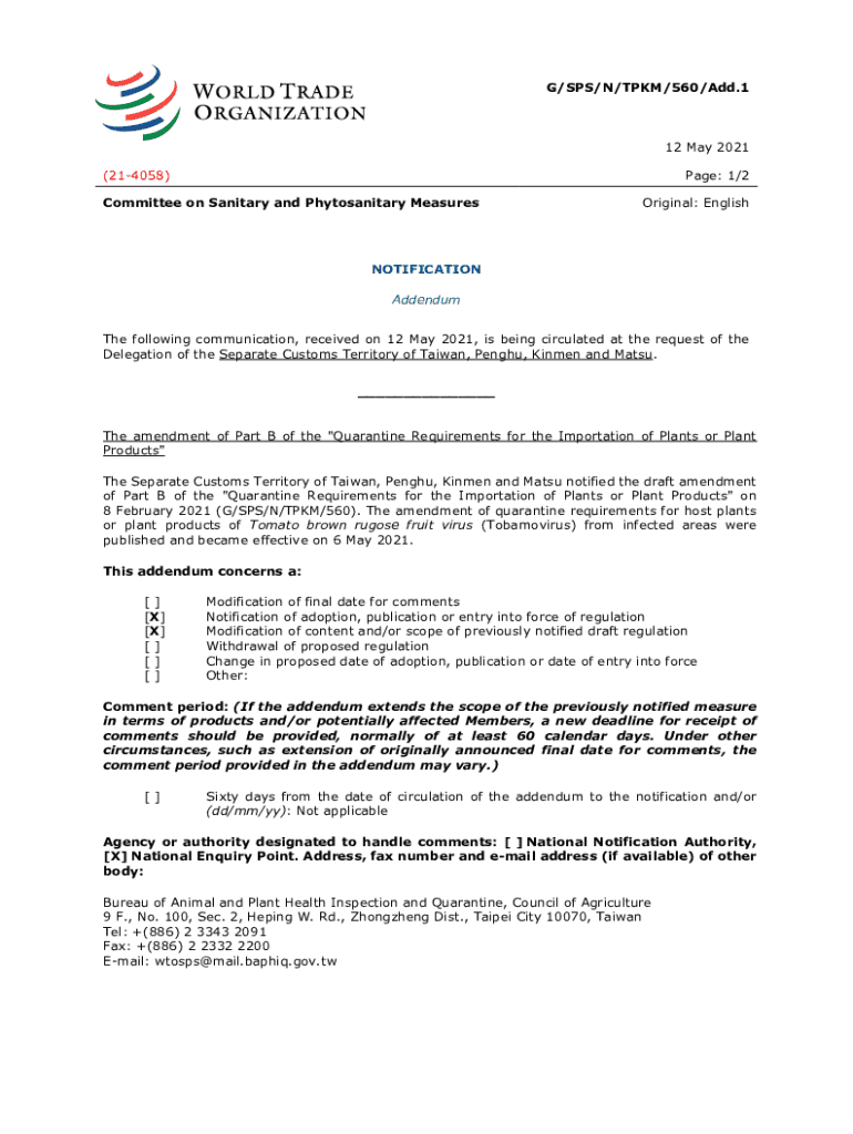 G/SPS/N/TPM/560/Add.112 May 2021 (214058)Page: 1/2Committee on Sanitary and Phytosanitary MeasuresOriginal: EnglishNOTIFICATION Addendum The following communication, received on 12 May 2021, is being