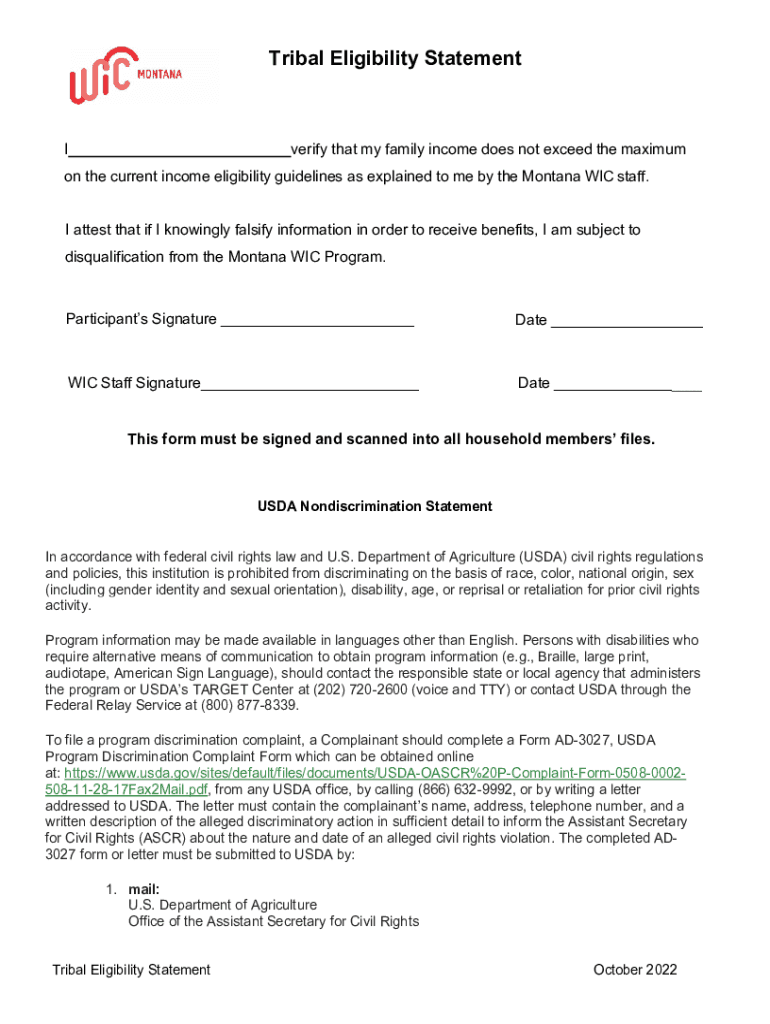 Tribal Eligibility StatementIverify that my family income does not exceed the maximum on the current income eligibility guidelines as explained to me by the Montana WIC staff. I attest that if I knowingly