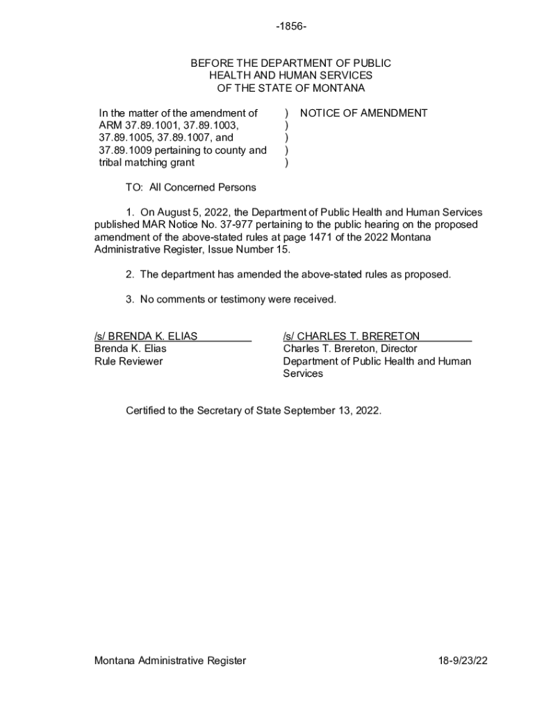 1856BEFORE THE DEPARTMENT OF PUBLIC HEALTH AND HUMAN SERVICES OF THE STATE OF MONTANA In the matter of the amendment of ARM 37.89.1001, 37.89.1003, 37.89.1005, 37.89.1007, and 37.89.1009 pertaining