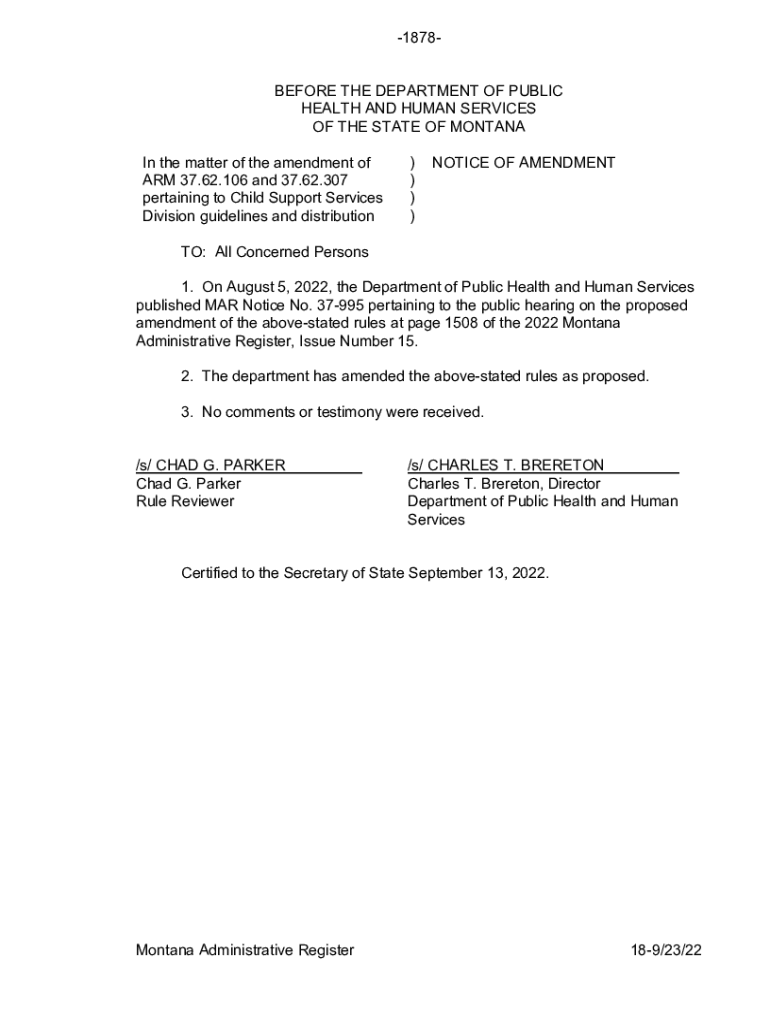 1878BEFORE THE DEPARTMENT OF PUBLIC HEALTH AND HUMAN SERVICES OF THE STATE OF MONTANA In the matter of the amendment of ARM 37.62.106 and 37.62.307 pertaining to Child Support Services Division guidelines