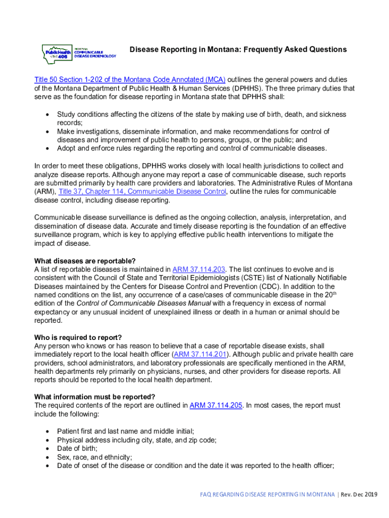 Disease Reporting in Montana: Frequently Asked QuestionsTitle 50 Section 1202 of the Montana Code Annotated (MCA) outlines the general powers and duties of the Montana Department of Public Health