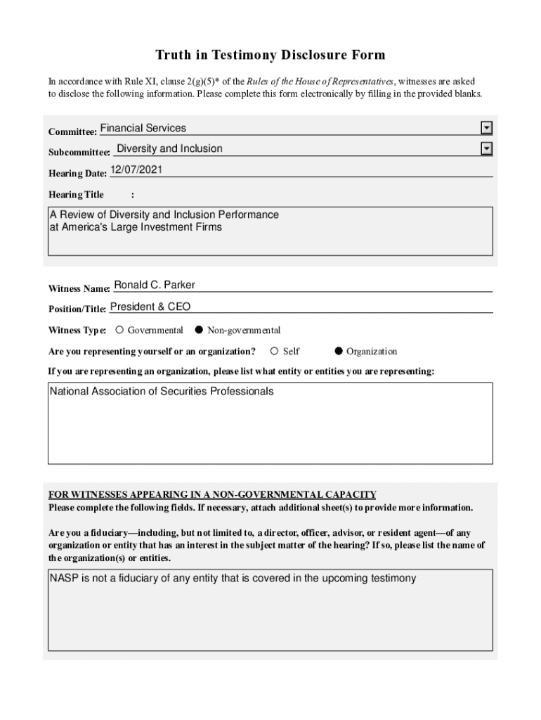 Truth in Testimony Disclosure Form In accordance with Rule XI, clause 2(g)(5)* of the Rules of the House of Representatives, witnesses are asked to disclose the following information. Please complete