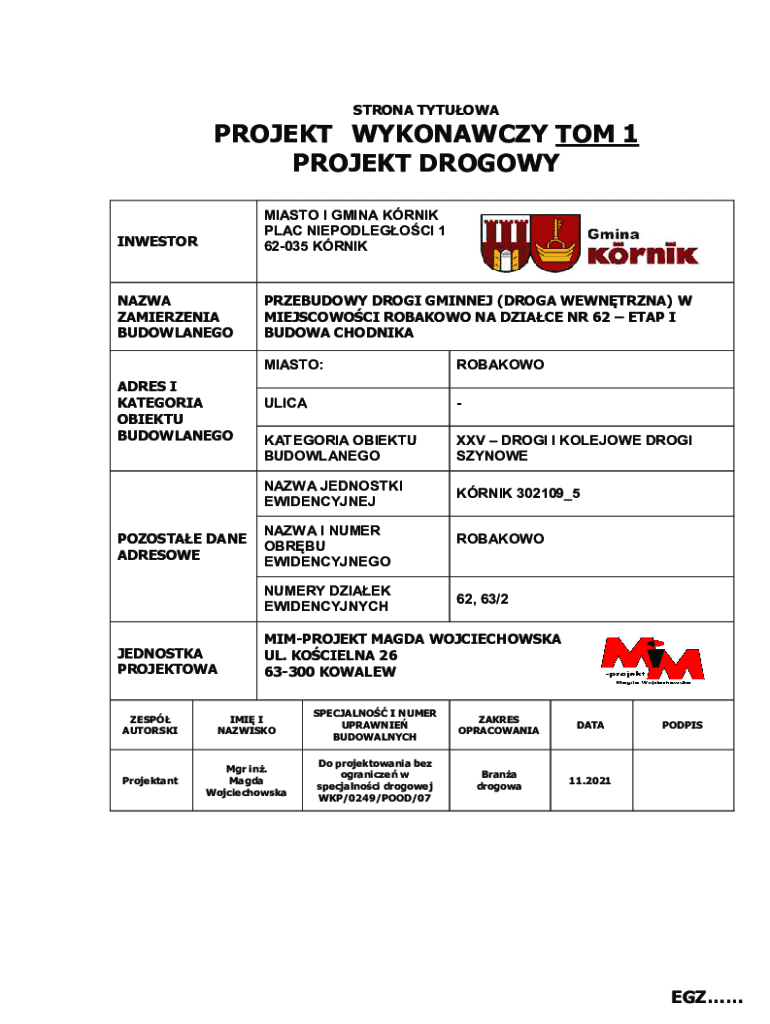 STRONG TYTUOWAPROJEKT WYKONAWCZY TOM 1 PROJECT DROOPY INWESTORMIASTO I GINA ERIK PLACE NIEPODLEGOCI 1 62035 KRNIKNAZWA ZAMIERZENIA BUDOWLANEGOPRZEBUDOWY DOG GRINNED (DOG WEWNTRZNA) W MIEJSCOWOCI ROBAKOWO
