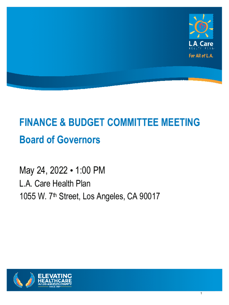 FINANCE & BUDGET COMMITTEE MEETING Board of Governors May 24, 2023 1:00 PM L.A. Care Health Plan 1055 W. 7th Street, Los Angeles, CA 900171AGENDAFinance & Budget Committee Meeting Board of Governors