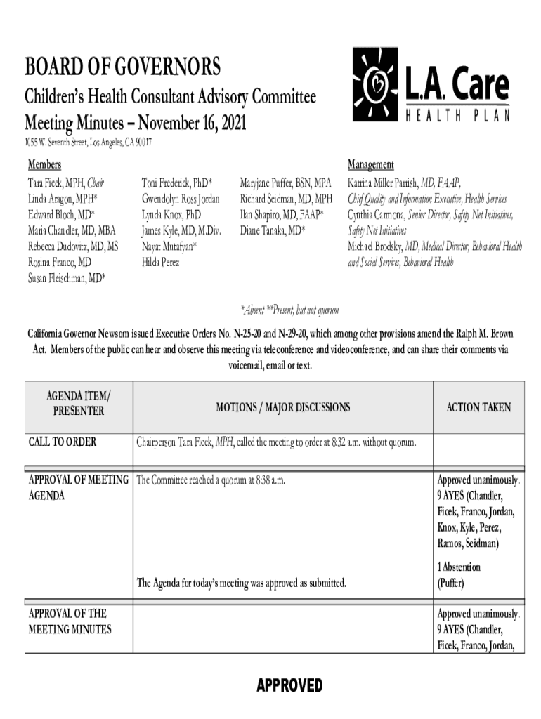 BOARD OF GOVERNORSChildrens Health Consultant Advisory Committee Meeting Minutes November 16, 2021 1055 W. Seventh Street, Los Angeles, CA 90017Members Tara Fine, MPH, Chair Linda Aragon, MPH* Edward