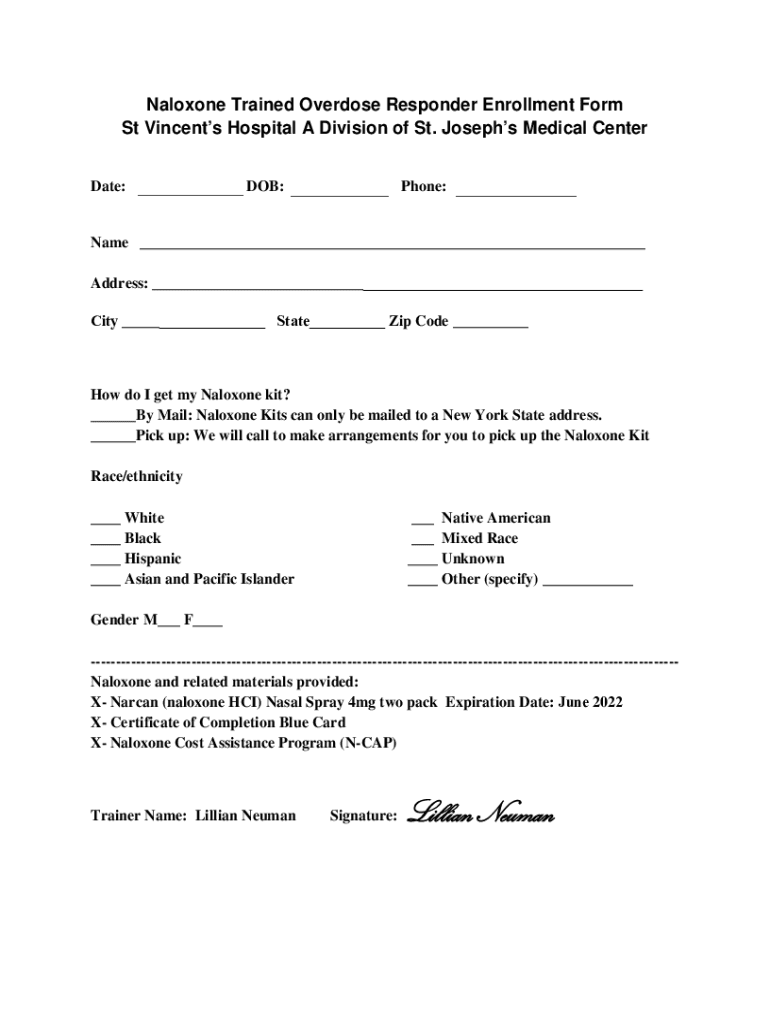Naloxone Trained Overdose Responder Enrollment Form St Vincent's Hospital A Division of St. Josephs Medical Center Date: ___ DOB: ___ Phone: ___ Name ___ Address: ___ City ___ State___ Zip Code ___How