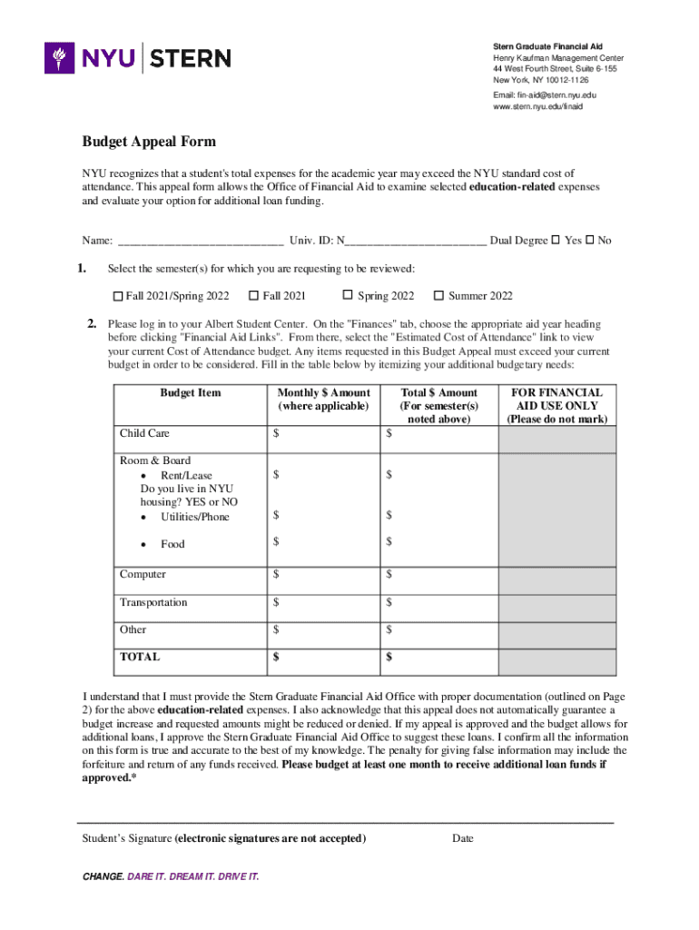 Stern Graduate Financial Aid Henry Kaufman Management Center 44 West Fourth Street, Suite 6155 New York, NY 100121126 Email: finaid@stern.nyu.edu www.stern.nyu.edu/finaidBudget Appeal Form NYU recognizes