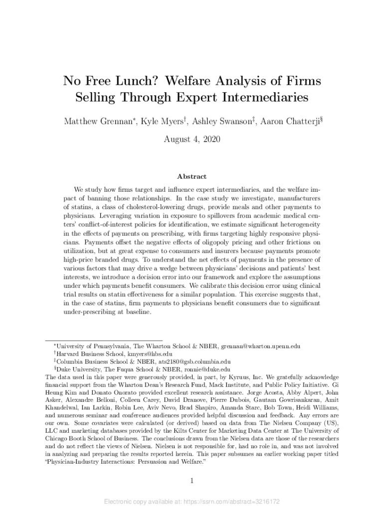 No Free Lunch? Welfare Analysis of Firms Selling Through Expert Intermediaries Matthew Brennan, Kyle Myers, Ashley Swanson, Aaron Chatter August 4, 2020Abstract We study how firms target and influence