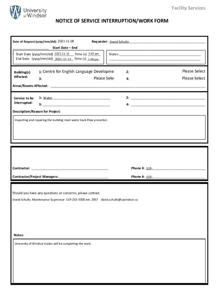 Facility ServicesNOTICE OF SERVICE INTERRUPTION/WORK Format of Request (YYY/mm/dd): 20211109___Requester: ___ David SchultzStart Date Endgame date Interruption/Closure 20211111 7:30 am Start (YYY/mm/dd)