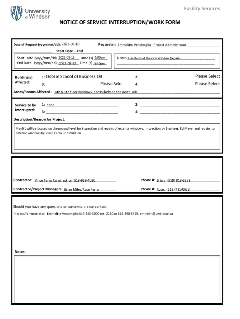Facility ServicesNOTICE OF SERVICE INTERRUPTION/WORK Format of Request (YYY/mm/dd): 20210810___Requester: ___ Emmeline Ventimiglia Project Administrator Start Date Endgame date Interruption/Closure