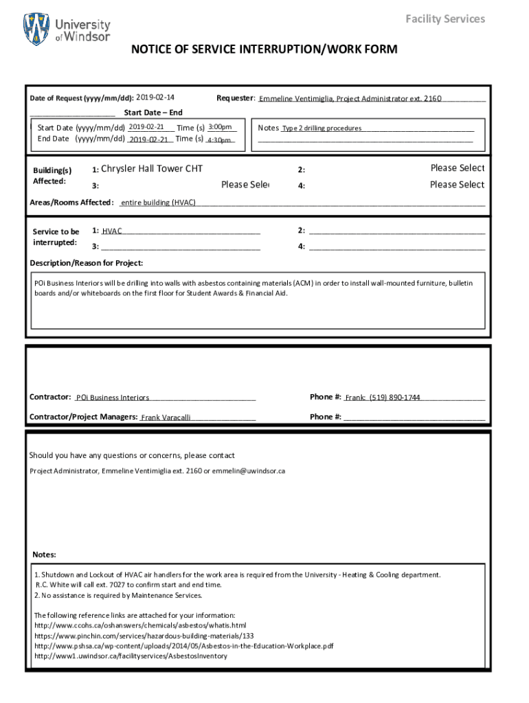 Facility ServicesNOTICE OF SERVICE INTERRUPTION/WORK Format of Request (YYY/mm/dd): 20190214___Requester: ___ Emmeline Ventimiglia, Project Administrator ext. 2160Start Date Endgame date Interruption/Closure