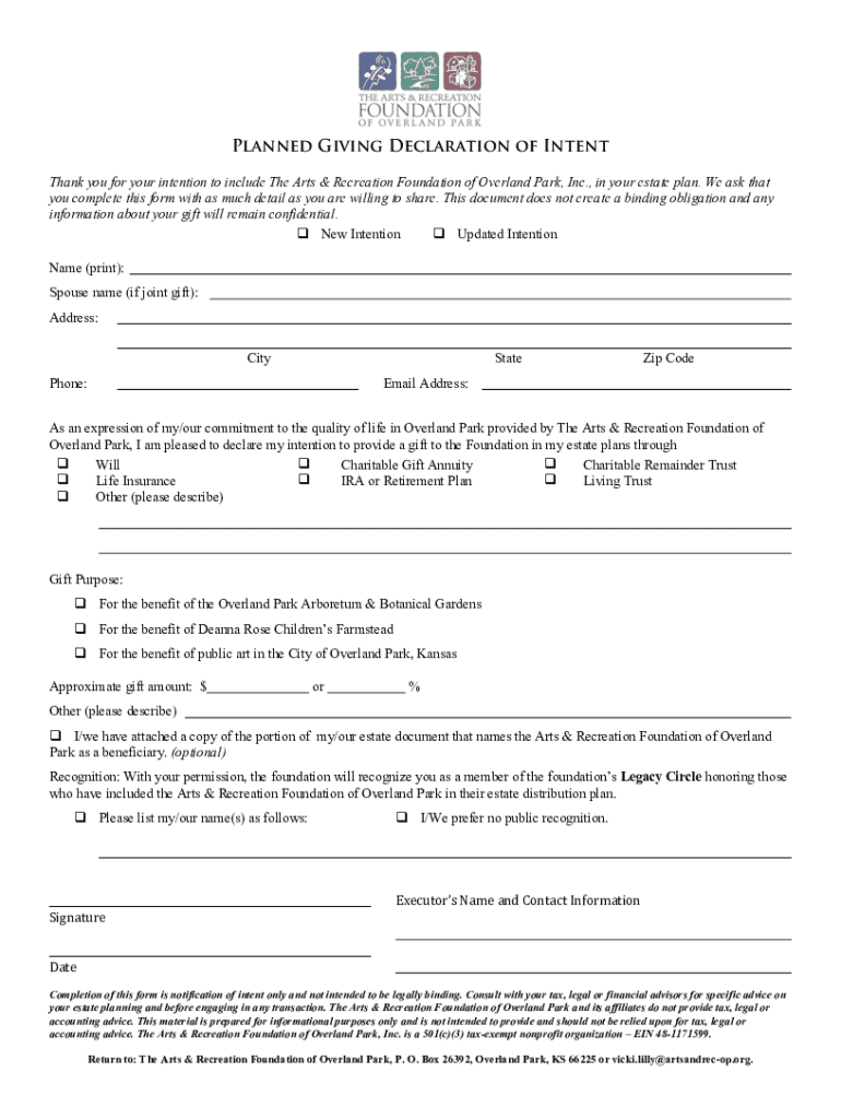 Planned Giving Declaration of Intent Thank you for your intention to include The Arts & Recreation Foundation of Overland Park, Inc., in your estate plan. We ask that you complete this form with as