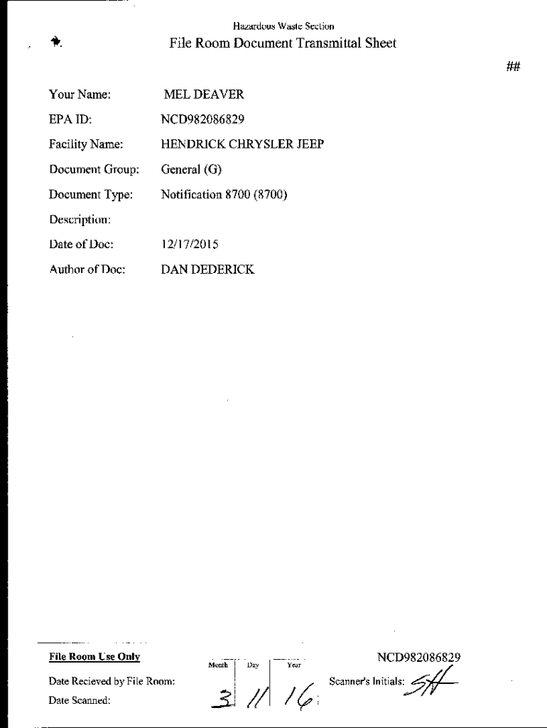 . Hazardous Waste Sectionize Room Document Transmittal Sheet ##Your Name:MEL DEAVEREPAID:NCD982086829Facility Name:HENDRICK CHRYSLER JEEPDocument Group:General (G)Document Type:Notification 8700 (8700)Description: