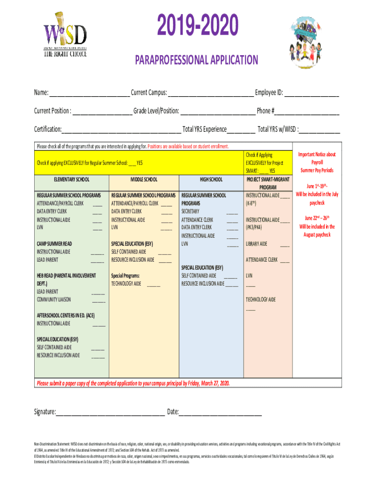 20192020 PARAPROFESSIONAL APPLICATION Names: ___ Current Campus: ___ Employee ID: ___ Current Position : ___ Grade Level/Position: ___ Phone #___ Certification:___ Total YRS Experience___ Total YRS