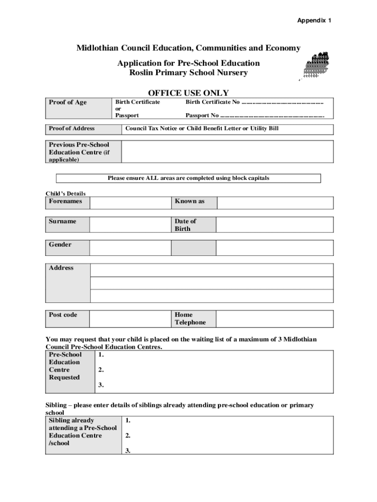 Appendix 1Midlothian Council Education, Communities and Economy Application for Preschool Education Rosin Primary School Nursery OFFICE USE ONLY Birth Certificate or PassportProof of Reproof of AddressBirth