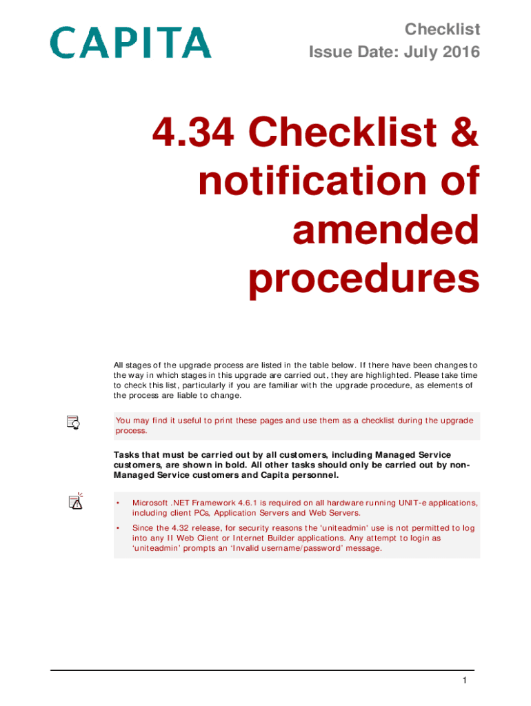 Checklist Issue Date: July 20164.34 Checklist & notification of amended procedures All stages of the upgrade process are listed in the table below. If there have been changes to the way in which stages