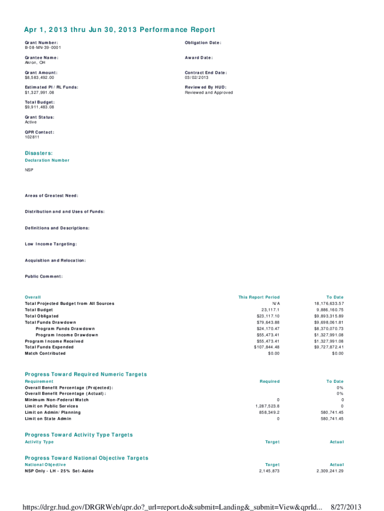 Apr 1, 2013 through Jun 30, 2013 Performance Report Grant Number: B08MN390001Obligation Date:Grantee Name: Akron, OHAward Date:Grant Amount: $8,583,492.00Contract End Date: 03/02/2013Estimated PI/RL