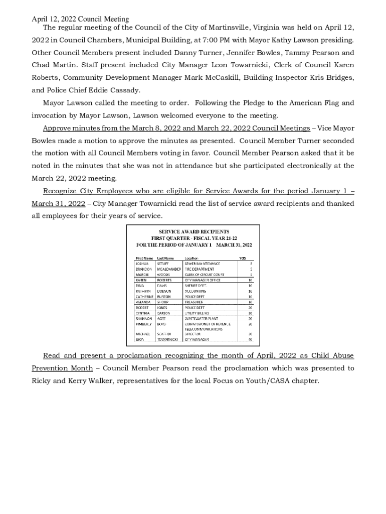 April 12, 2023, Council Meeting regular meeting of the Council of the City of Martinsville, Virginia was held on April 12, 2023, in Council Chambers, Municipal Building, at 7:00 PM with Mayor Kathy