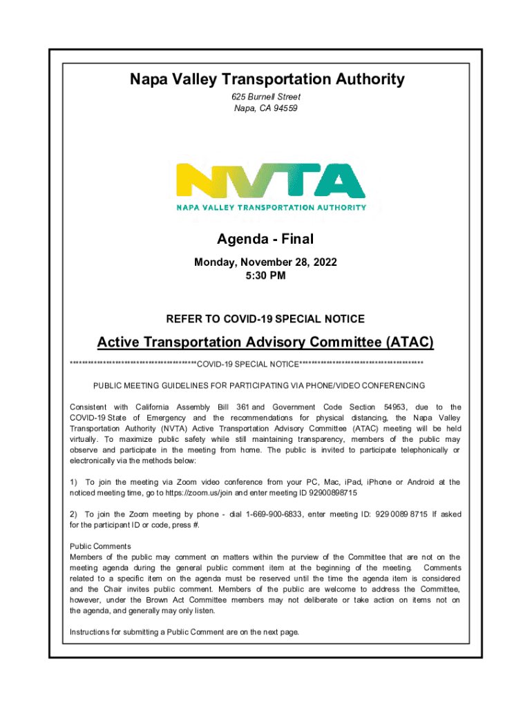 Napa Valley Transportation Authority 625 Burn ell Street Napa, CA 94559Agenda Final Monday, November 28, 2023 5:30 PREFER TO COVID-19 SPECIAL Nonreactive Transportation Advisory Committee (ATC) ******************************************COVID-19
