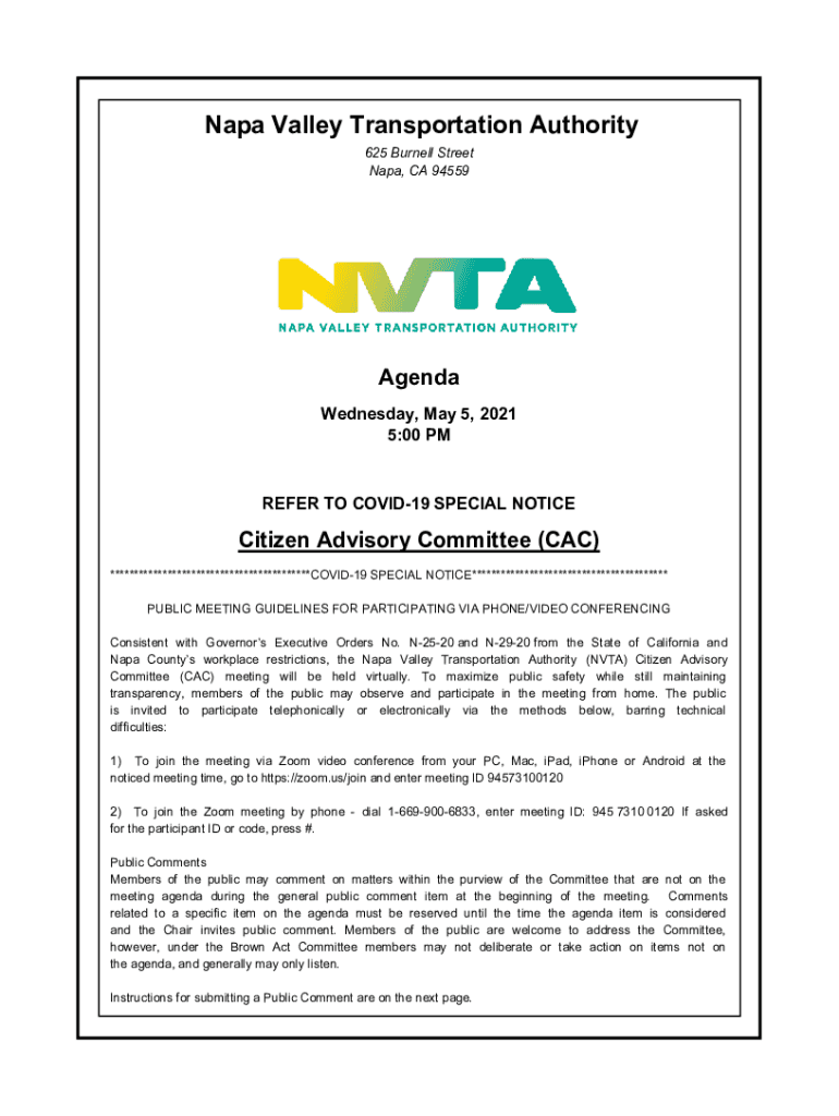 Napa Valley Transportation Authority 625 Burn ell Street Napa, CA 94559Agenda Wednesday, May 5, 2021 5:00 PREFER TO COVID-19 SPECIAL NOTICECitizen Advisory Committee (CAC) ******************************************COVID-19