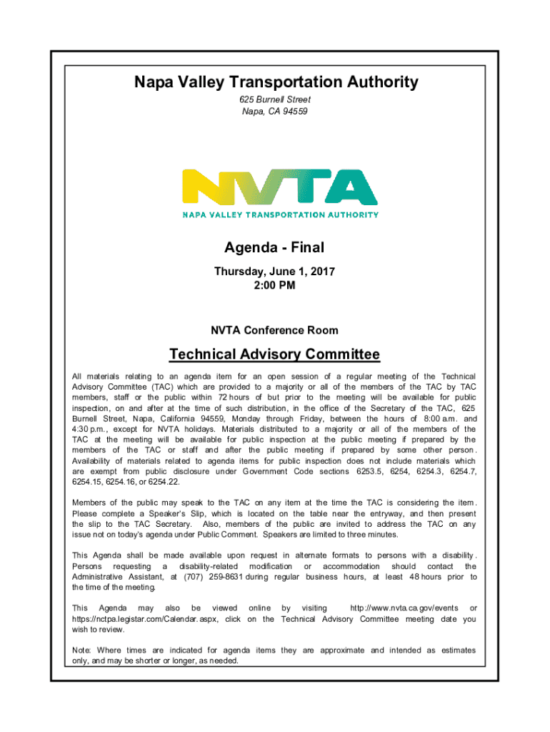 Napa Valley Transportation Authority 625 Burn ell Street Napa, CA 94559Agenda Final Thursday, June 1, 2017 2:00 PMN VTA Conference Nontechnical Advisory Committee All materials relating to an agenda