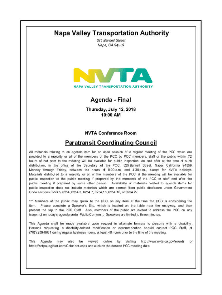 Napa Valley Transportation Authority 625 Burn ell Street Napa, CA 94559Agenda Final Thursday, July 12, 2018 10:00 AMN VTA Conference RoomParatransit Coordinating Council All materials relating to