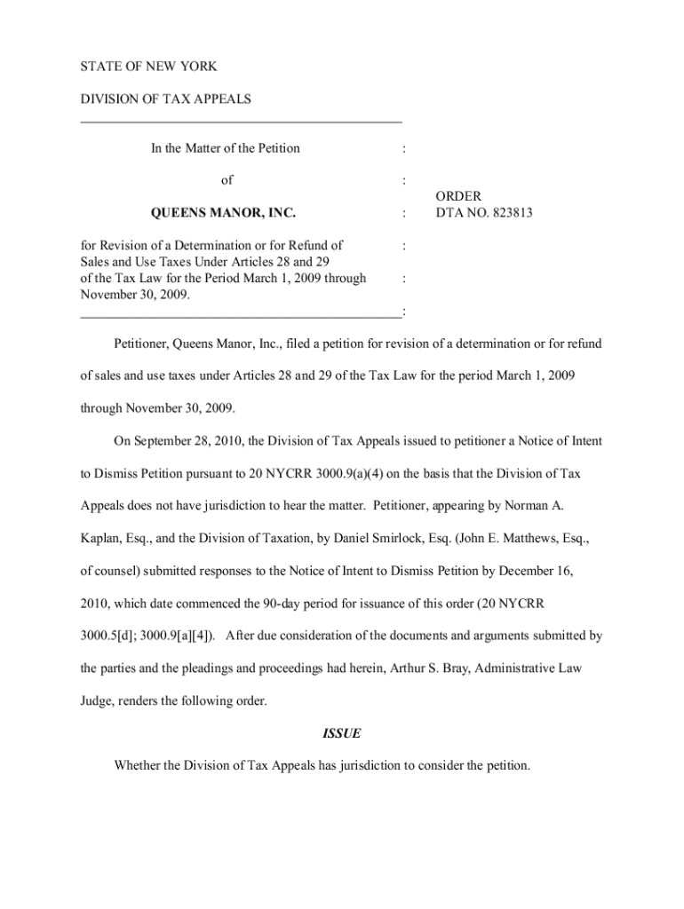 STATE OF NEW YORKDIVISION OF TAX APPEALS___ In the Matter of the Petition:of: :QUEENS MANOR, INC.ORDER DTA NO. 823813for Revision of a Determination or for Refund of : Sales and Use Taxes Under Articles
