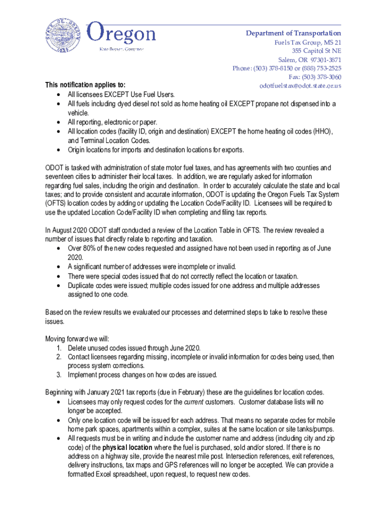 Department of Transportation Fuels Tax Group, MS 21 355 Capitol St NE Salem, OR 973013871 Phone: (503) 3788150 or (888) 7532525 Fax: (503) 3783060 odotfuelstax@odot.state.or.usThis notification applies
