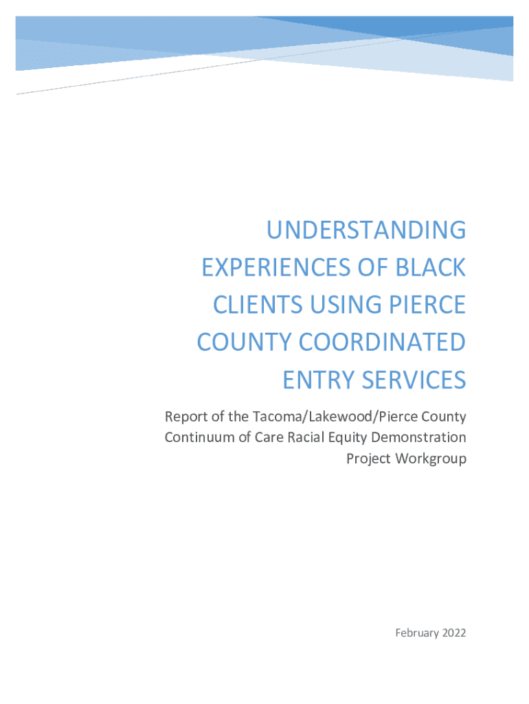 0UNDERSTANDING EXPERIENCES OF BLACK CLIENTS USING PIERCE COUNTY COORDINATED ENTRY SERVICES Report of the Tacoma/Lakewood/Pierce County Continuum of Care Racial Equity Demonstration Project WorkgroupFebruary
