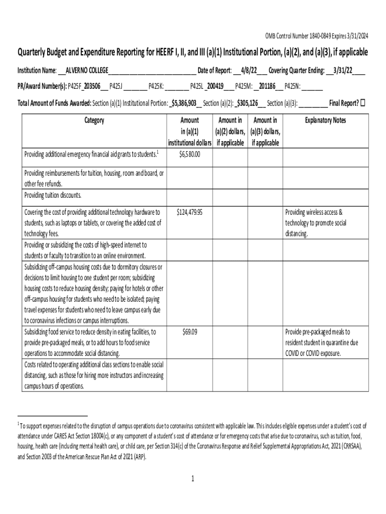OMB Control Number 18400849 Expires 3/31/2024Quarterly Budget and Expenditure Reporting for The ERF I, II, and III (a)(1) Institutional Portion, (a)(2), and (a)(3), if applicable Institution Name: