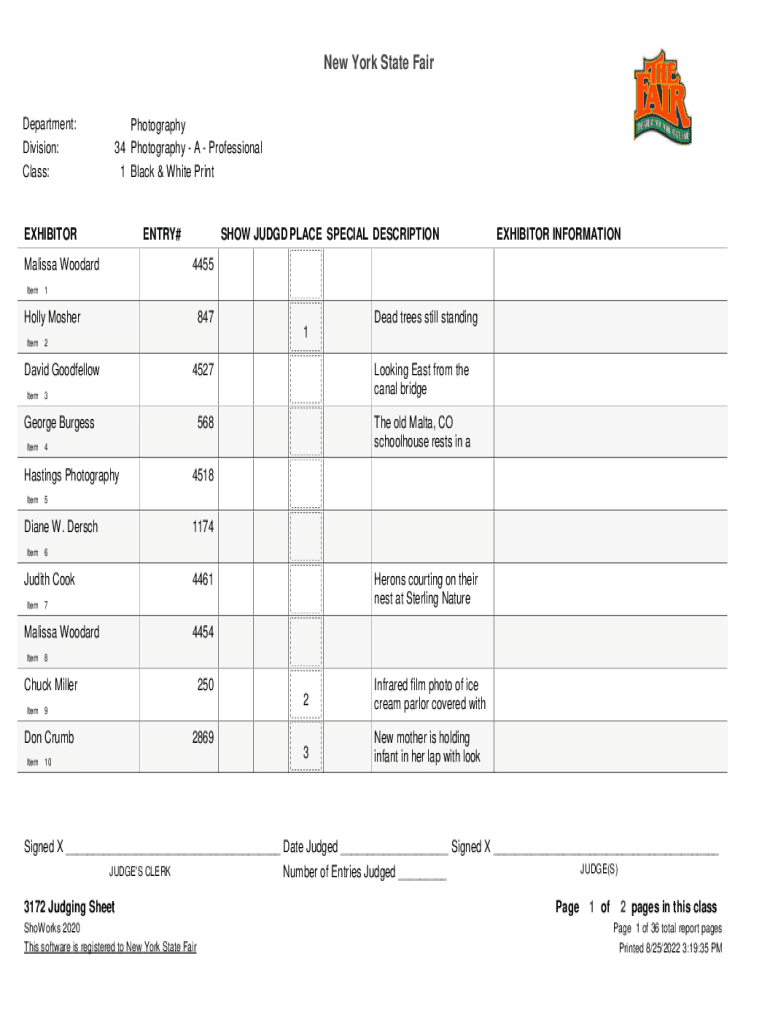 New York State Fair Department: Division: Class:Photography 34 Photography A Professional 1 Black & White PrintEXHIBITOR Melissa Woodard Elementary#SHOW JUDGE PLACE SPECIAL DESCRIPTION 44551Holly