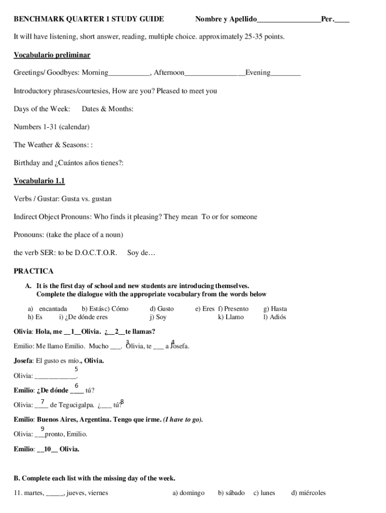 BENCHMARK QUARTER 1 STUDY GUIDENombre y Apellido___Per.___It will have listening, short answer, reading, multiple choice. Approximately 2535 points. Vocabulary preliminary Greetings/ Goodbyes: Morning___,
