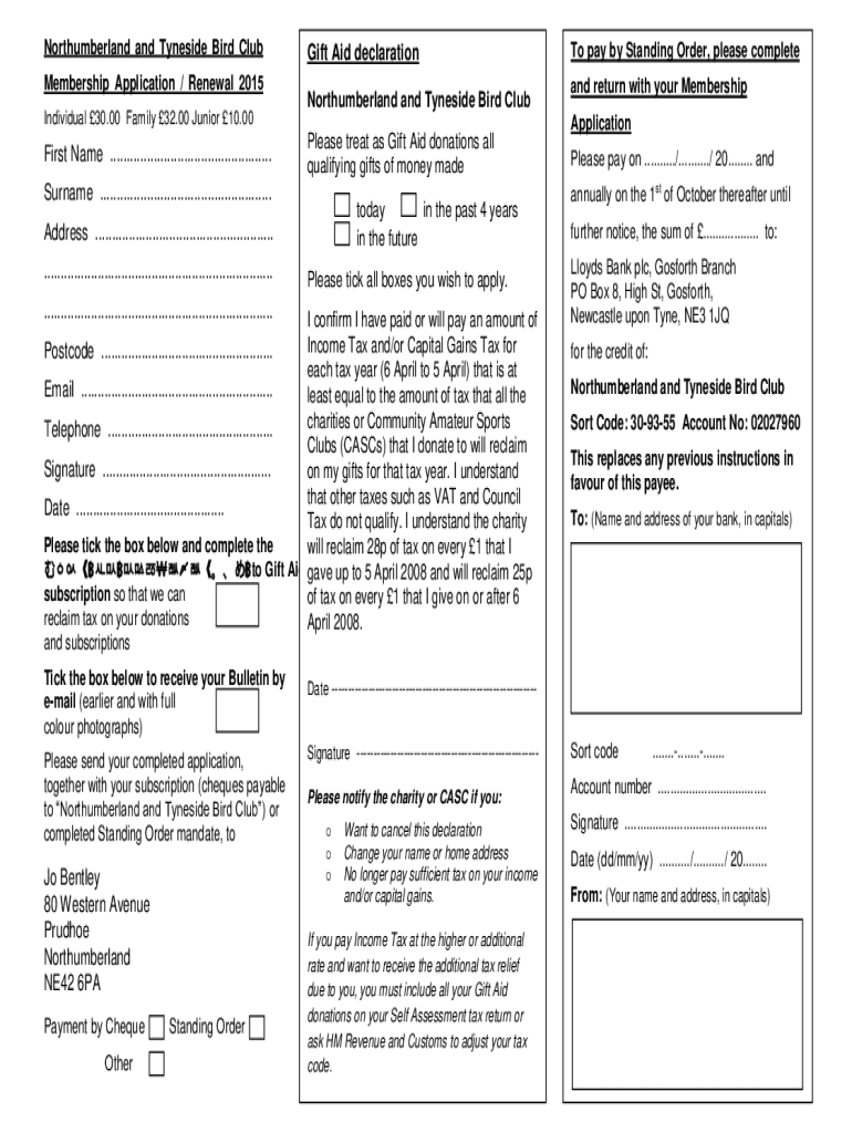 Northumberland and Inside Bird Club Membership Application / Renewal 2015 Individual 30.00 Family 32.00 Junior 10.00First Name ................................................ Gift Aid declaration