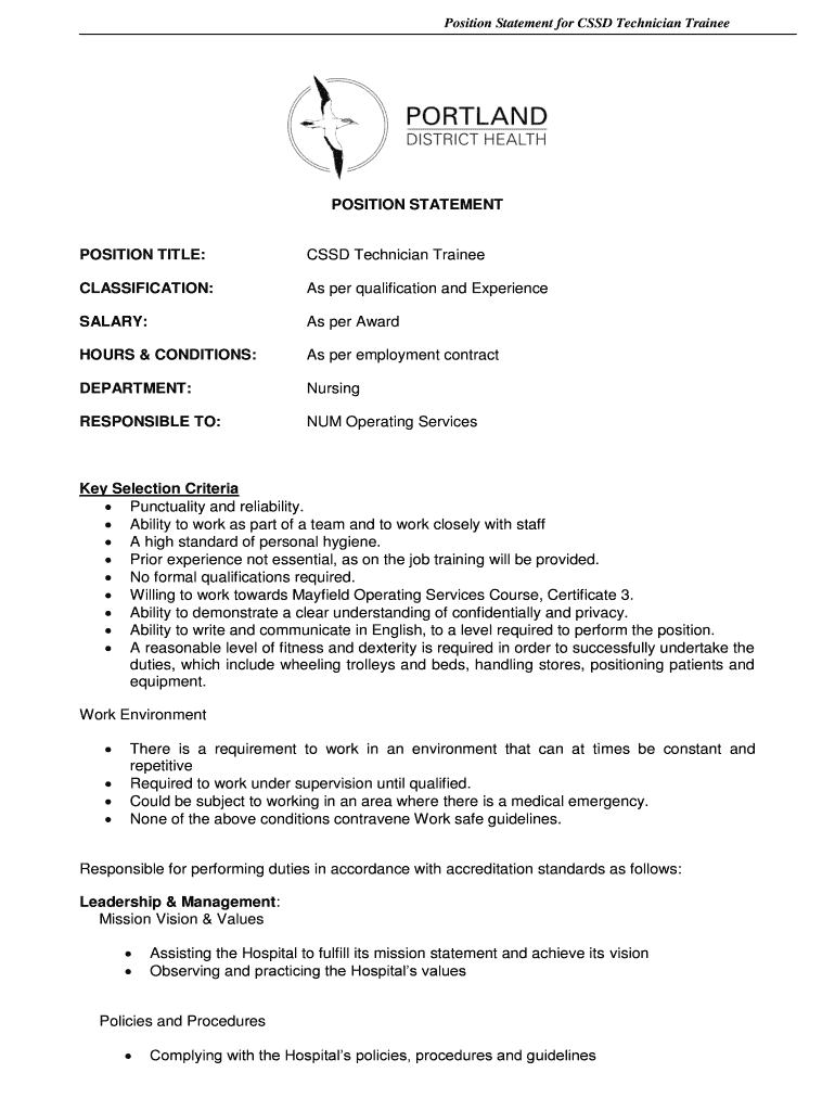 The purpose of the position statement position title is to clearly define the role and expectations for the position.
