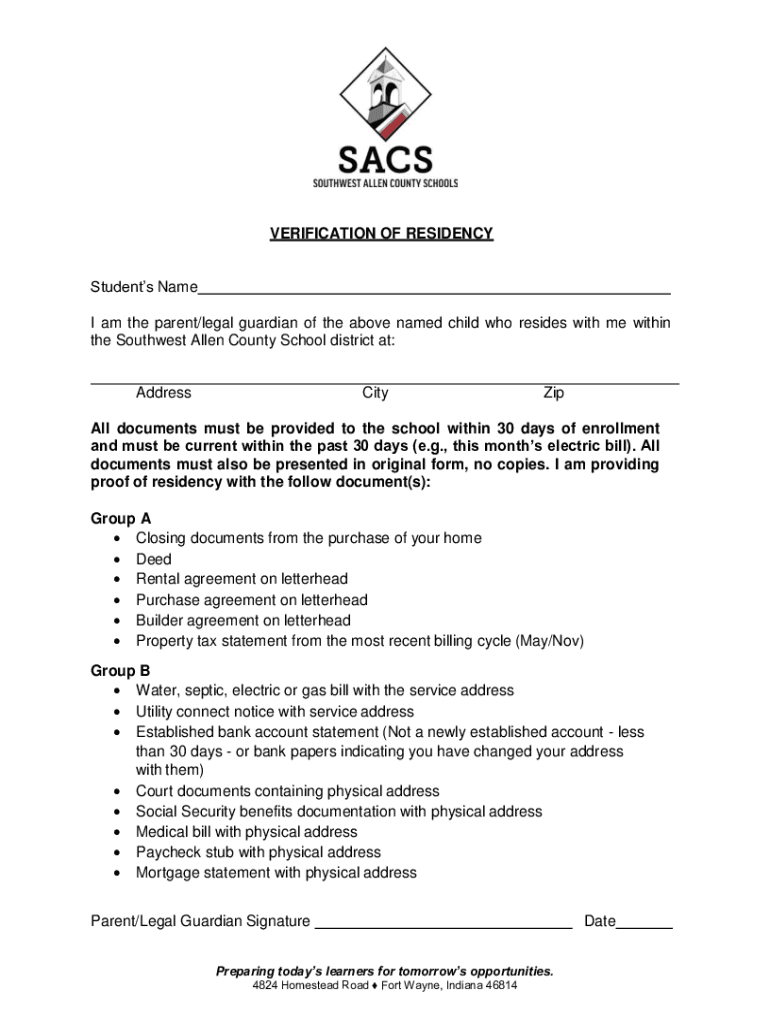 VERIFICATION OF RESIDENCY Students Name I am the parent/legal guardian of the above named child who resides with me within the Southwest Allen County School district at: AddressCityZipAll documents