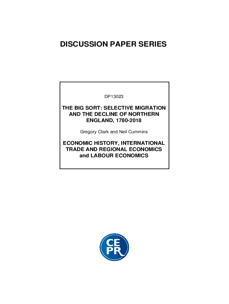 DISCUSSION PAPER SERIESDP13023THE BIG SORT: SELECTIVE MIGRATION AND THE DECLINE OF NORTHERN ENGLAND, 17802018 Gregory Clark and Neil CumminsECONOMIC HISTORY, INTERNATIONAL TRADE AND REGIONAL ECONOMICS