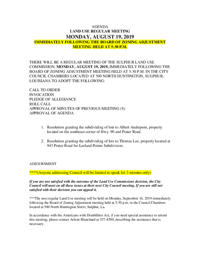 AGENDA LAND USE REGULAR MEETINGMONDAY, AUGUST 19, 2019, IMMEDIATELY FOLLOWING THE BOARD OF ZONING ADJUSTMENT MEETING HELD AT 5:30 P.M.THERE WILL BE A REGULAR MEETING OF THE Sulfur LAND USE COMMISSION,