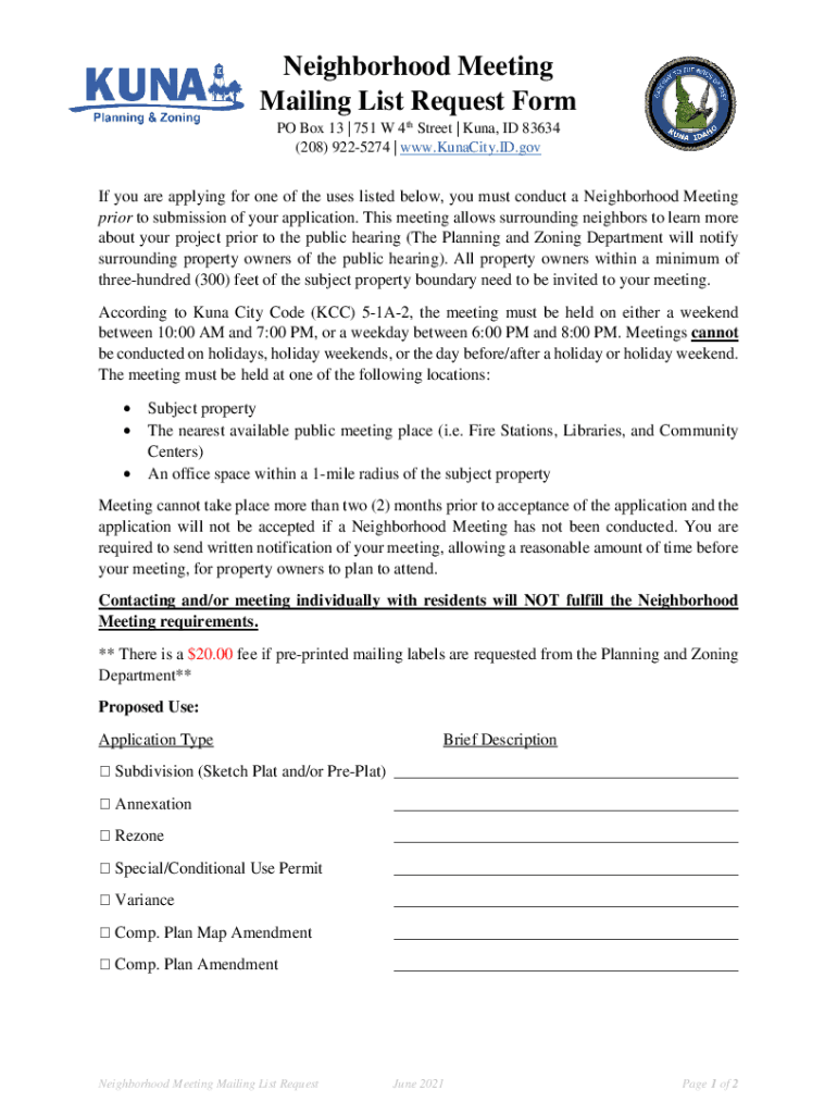 Neighborhood Meeting Mailing List Request Form PO Box 13 | 751 W 4th Street | Luna, ID 83634 (208) 9225274 | www.KunaCity.ID.govIf you are applying for one of the uses listed below, you must conduct