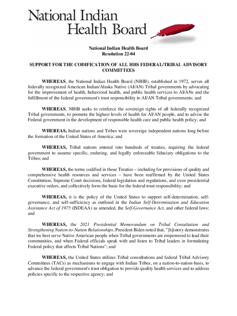 National Indian Health Board Resolution 2204 SUPPORT FOR THE CODIFICATION OF ALL HHS FEDERAL/TRIBAL ADVISORY COMMITTEES WHEREAS, the National Indian Health Board (NIB), established in 1972, serves