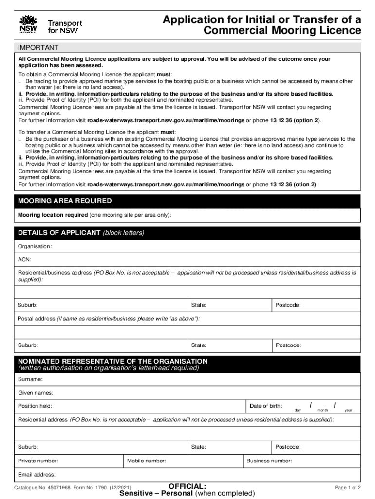 Application for Initial or Transfer of a Commercial Mooring License IMPORTANT All Commercial Mooring License applications are subject to approval. You will be advised of the outcome once your application