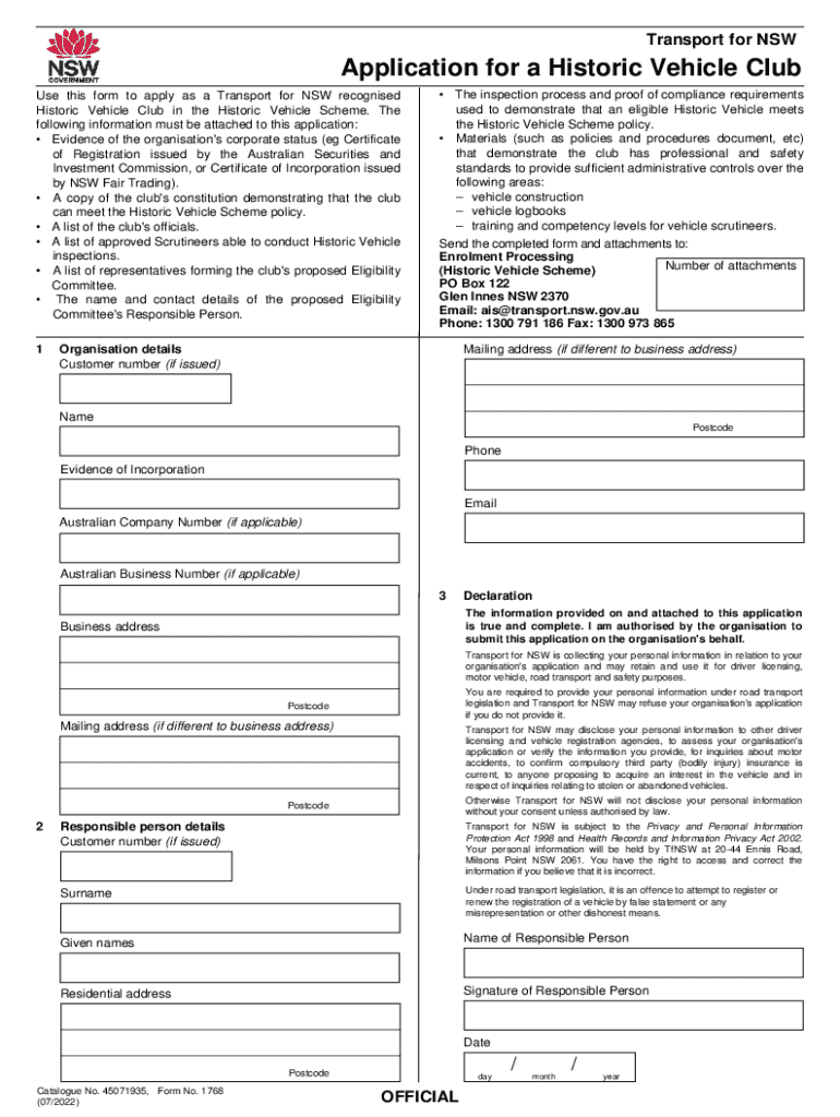 Transport for Application for a Historic Vehicle Club Use this form to apply as Transport for NSW recognized Historic Vehicle Club in the Historic Vehicle Scheme. The following information must be