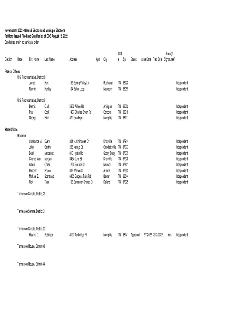 November 8, 2023 General Election and Municipal Elections Petitions Issued, Filed and Qualified as of COB August 12, 2023, Candidates are in no particular order. ElectionRaceFirst Nameless Name Federal