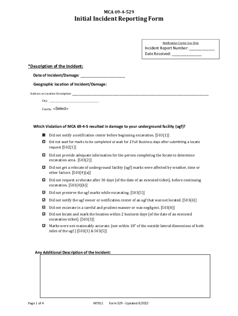 MCA 694529Initial Incident Reporting Fortification Center Use OnlyIncident Report Number: ___ Date Received: ___*Description of the Incident: Date of Incident/Damage: ___ Geographic location of Incident/Damage: